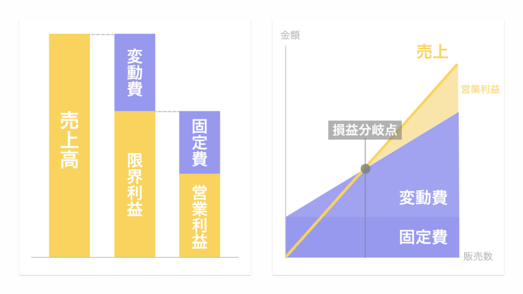 限界利益とは売上から変動費を引いたものであり、限界利益により固定費を賄えたときが営業黒字になります。また売上高の構成比が固定費と変動費のみで占められるポイントが損益分岐点であり、その点を超えると営業利益が生じていきます。